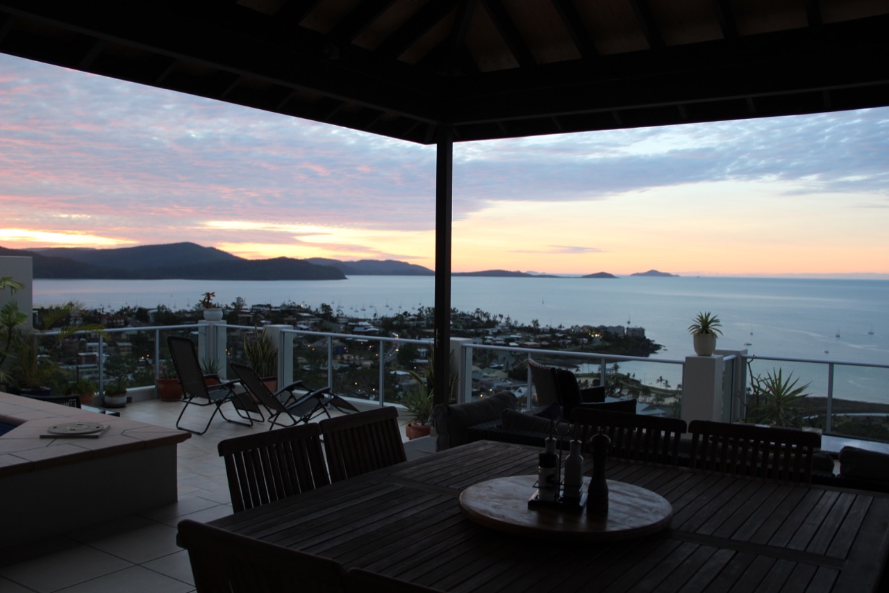 Dann ging es weiter nach Airlie Beach. Bei durchschnittlich 80 km/h kommt man gar nicht so schnell voran, wie man denkt. Kurz vor Sonnenuntergang erreichten wir unser heutiges Quartier, das wir auch über AirBnB gebucht haben. Unsere Gastgeber Ernie und Glenda haben ein wunderschönes Haus am Hang mit einer großartigen Aussicht auf Airlie Beach.