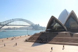 Direkt hinter dem botanischen Garten liegt auch schon das Sydney Opera House mit der Harbour Bridge dahinter.