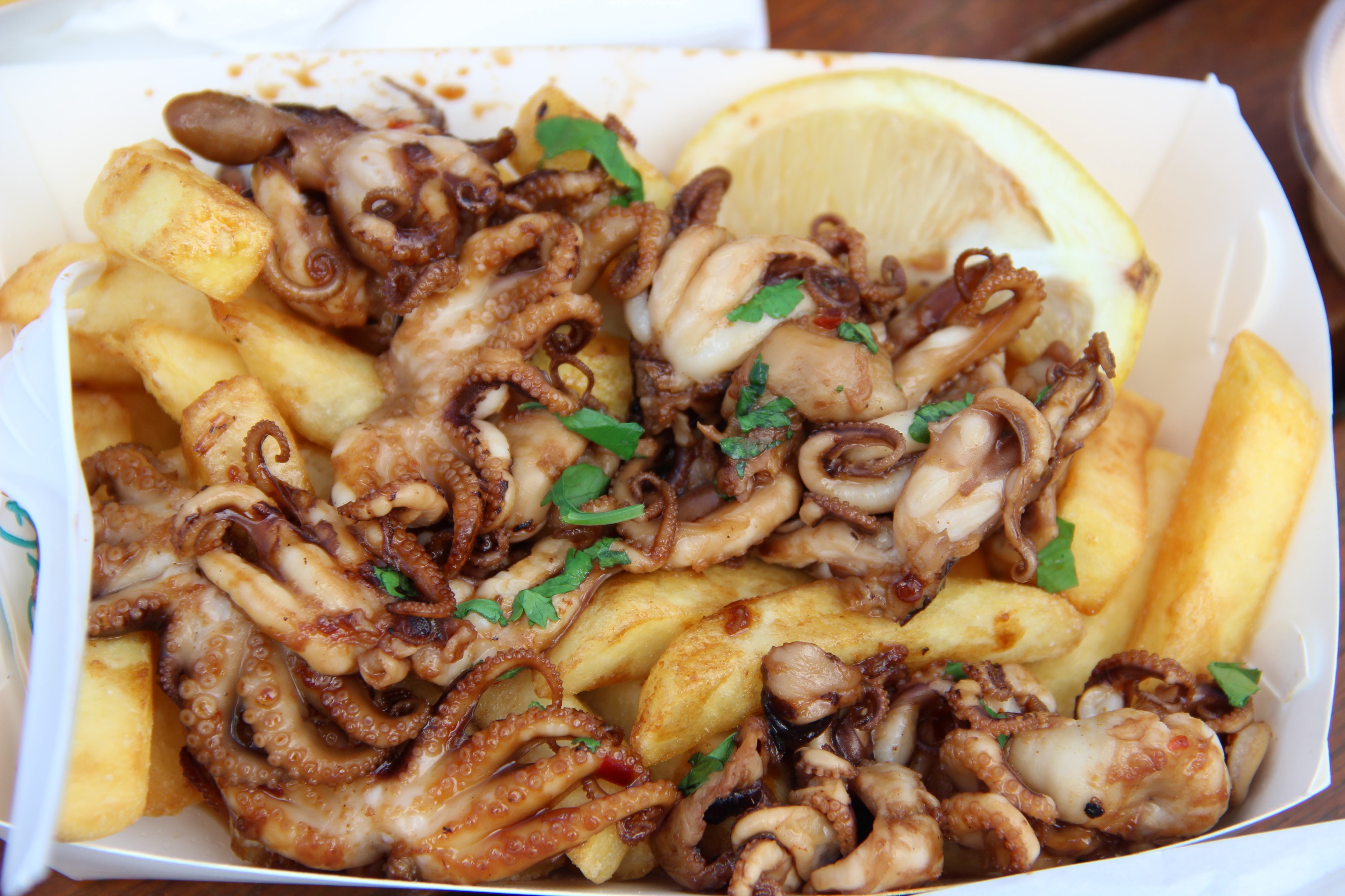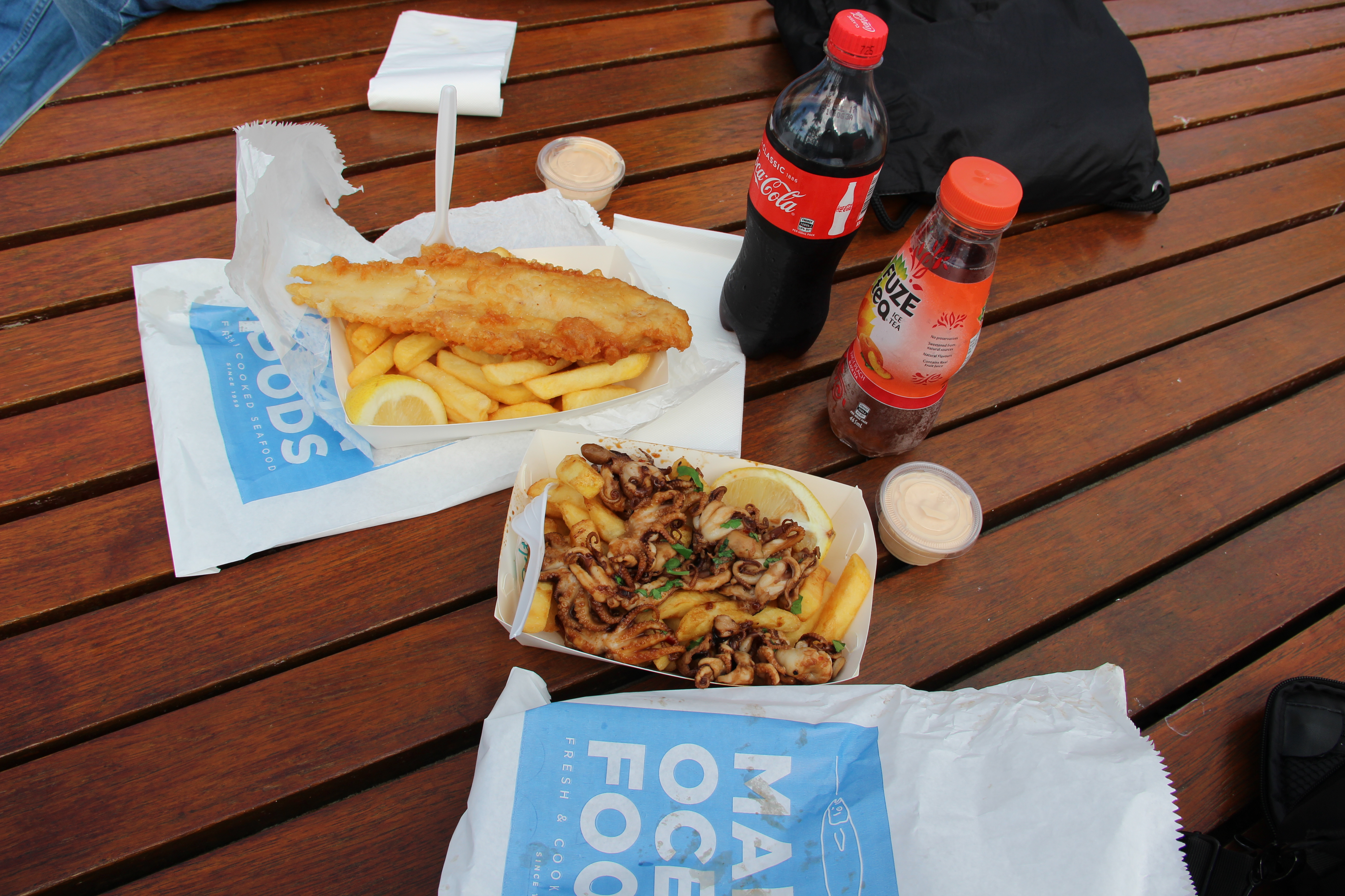 In Manley schauten wir uns die Surfer am Strand an und holten uns dann das erste typisch englisch-australische Essen – Fisch & Chips.